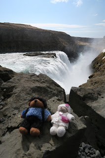 Toisena kohteena oli Gullfossin vesiputous. Tätä upeaa vesiputousta oli joku joskus meinannut valjastaa vesivoimalaksi. Oli tulleet Islantilaiset kuiten tolkkuihinsa ja pääsimme meki nauttimaan näistä komeista tyrskyistä ilman voimalaitosta. Paikkaa ei oikein osaa kuvailla sanoilla. Kattokaa kuvat ja ihmetelkää. Me ällisteltiin hyvä tovi tätä komeutta ja samalla syötiin eväsleivät mukavassa kallionkolossa suojassa tuulelta ja tyrskyiltä.